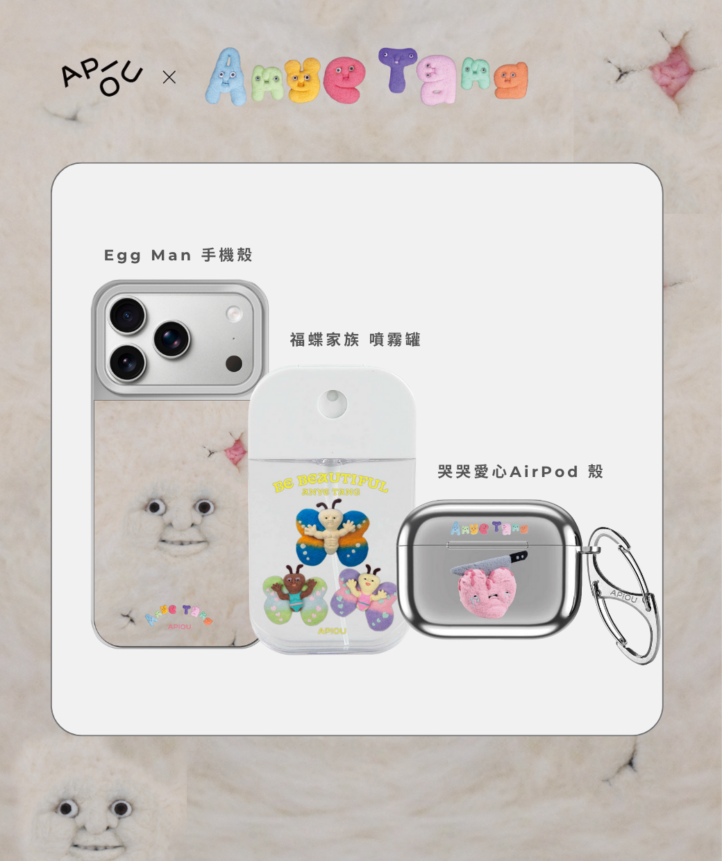 安爺堂:Egg Man 手機殼、福蝶家族 噴霧罐、哭哭愛心AirPod 殼,喜歡這次使用滿版印刷的Egg Man手機殼,很幽默!